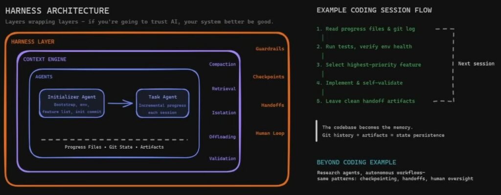 • Agent Harnesses: Là bước tiến tiếp theo, đóng vai trò như một lớp “vỏ bọc” (wrapper) kết nối nhiều phiên làm việc hoặc nhiều Agent chuyên biệt lại với nhau để xử lý các tác vụ dài hơi (long-running tasks).