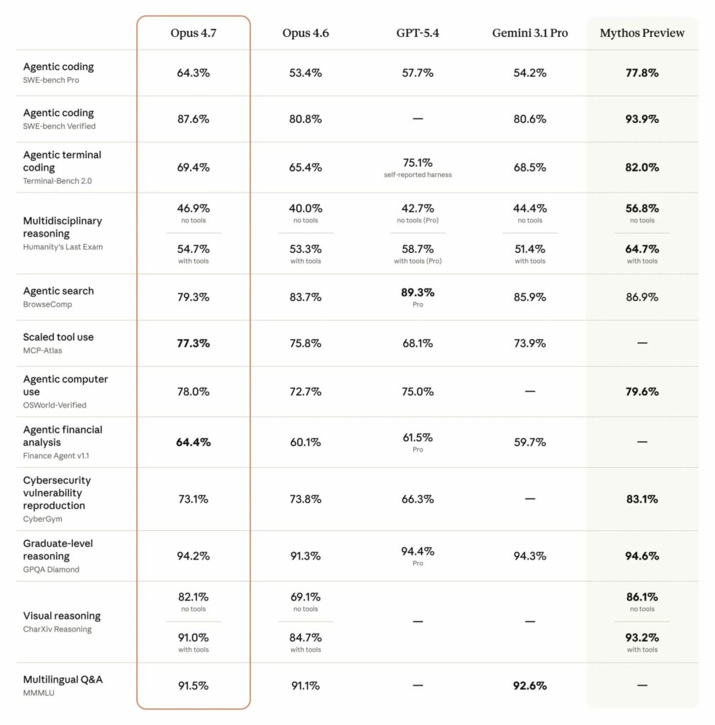 Trả lời: Có sự phân hóa rõ rệt. Opus 4.7 tỏ ra vượt trội trong các tác vụ lập trình độc lập (agentic coding) và phân tích tài chính. Tuy nhiên, theo một số benchmark, nó có thể hơi đuối hơn GPT-5.4 và Gemini 3.1 Pro ở khả năng tìm kiếm nâng cao và suy luận đa lĩnh vực sử dụng công cụ.